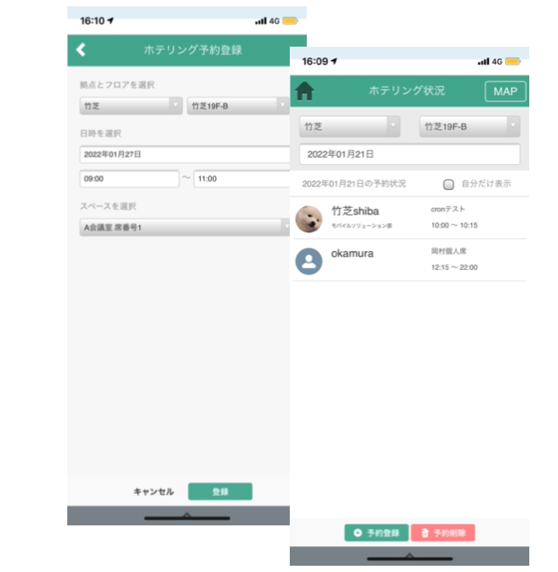 図1:新機能「ホテリング機能」の予約画面及び予約状況確認画面