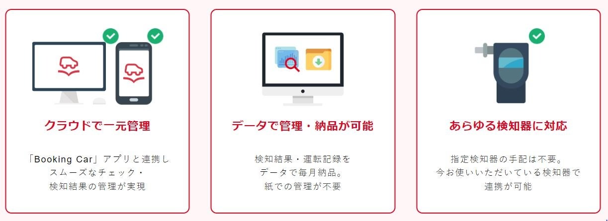 “Booking Car”はアルコールチェックの記録・保存の管理業務をワンストップでサポートしておりますが、企業の管理者の皆さまから