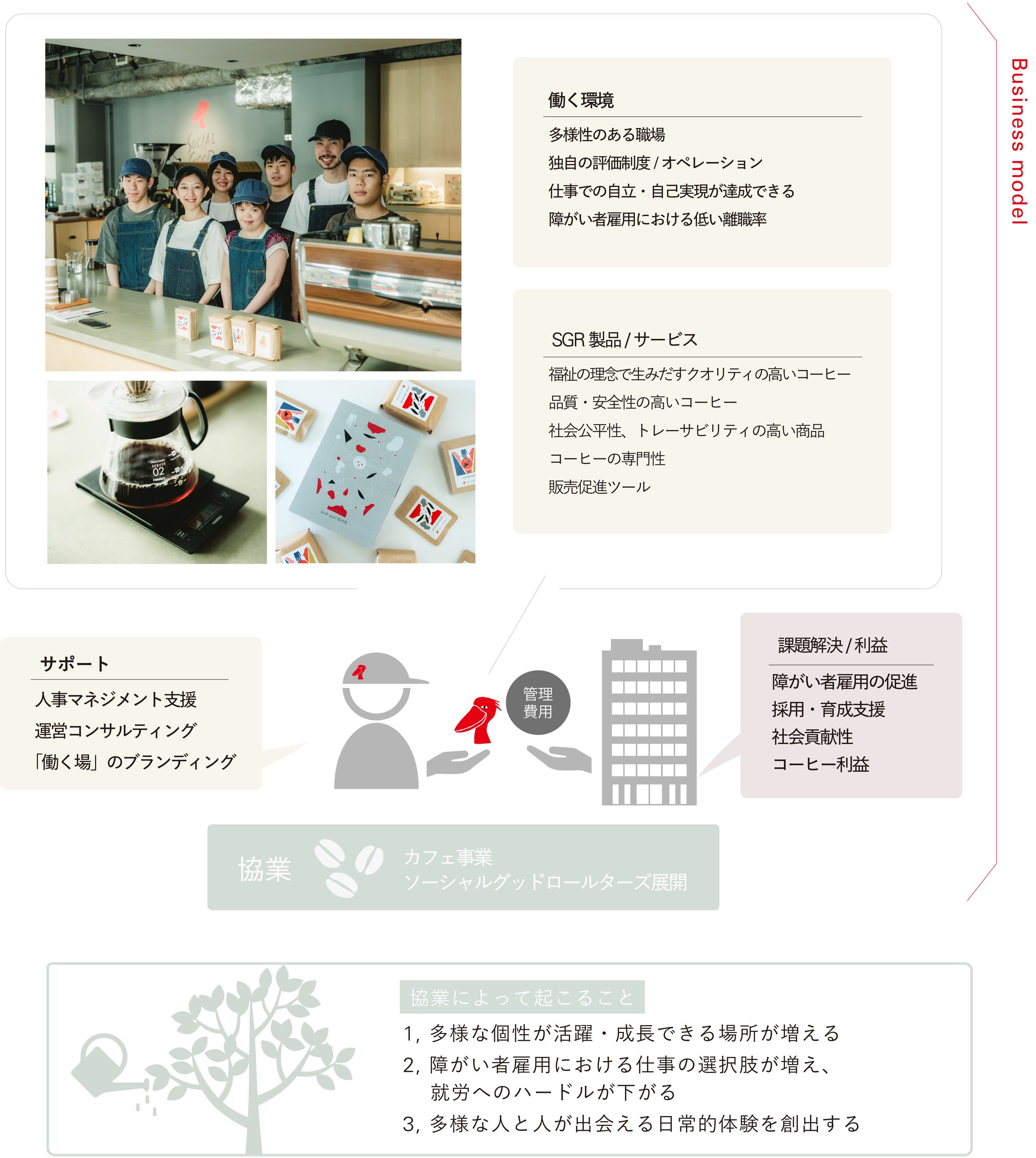 今回の協業によってSGRは、SZLHRが新たに切り開いた職域の「人材育成/マネジメント支援」「多様な人材が働く場のブランディング」「オペレーション」をサポート。同時にSZLHRは、SGRの活動の発展をサポートし、就労に困難のある方々が、コーヒーの仕事で自立、自己実現を達成することで、多様な個性が活躍する社会を推進します。
