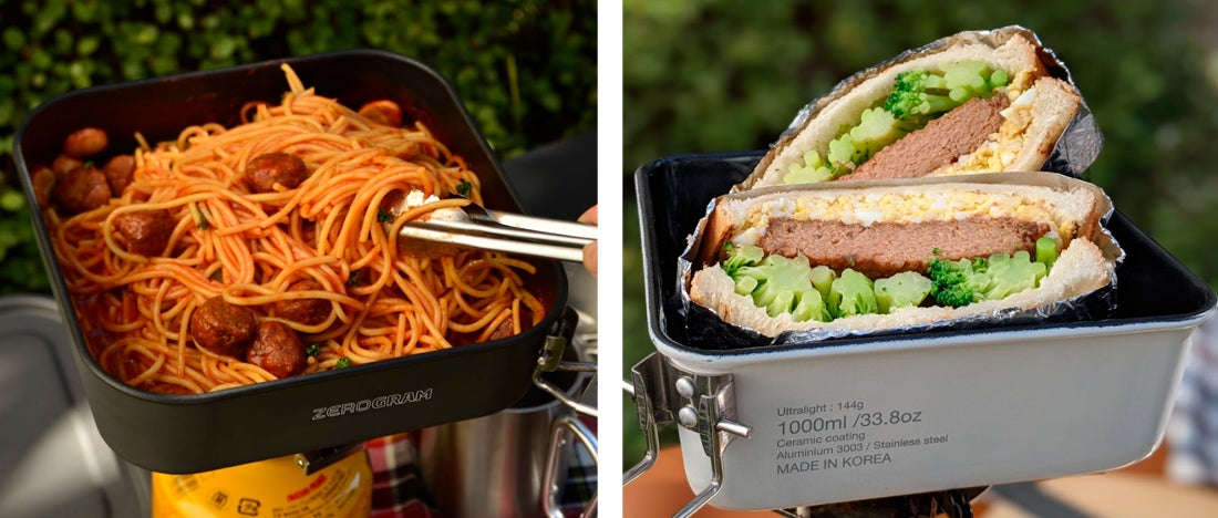 煮る、炊く、焼く、揚げるなど一通りの調理ができる正方形のフライパン。ハンドルが角についているので汁物が注ぎやすく液だれもしづらいです。焦げ付きづらいテフロン加工で、水場のないテント泊でもティッシュ等でスルッと汚れが落とせます。1人用と2人用があります。