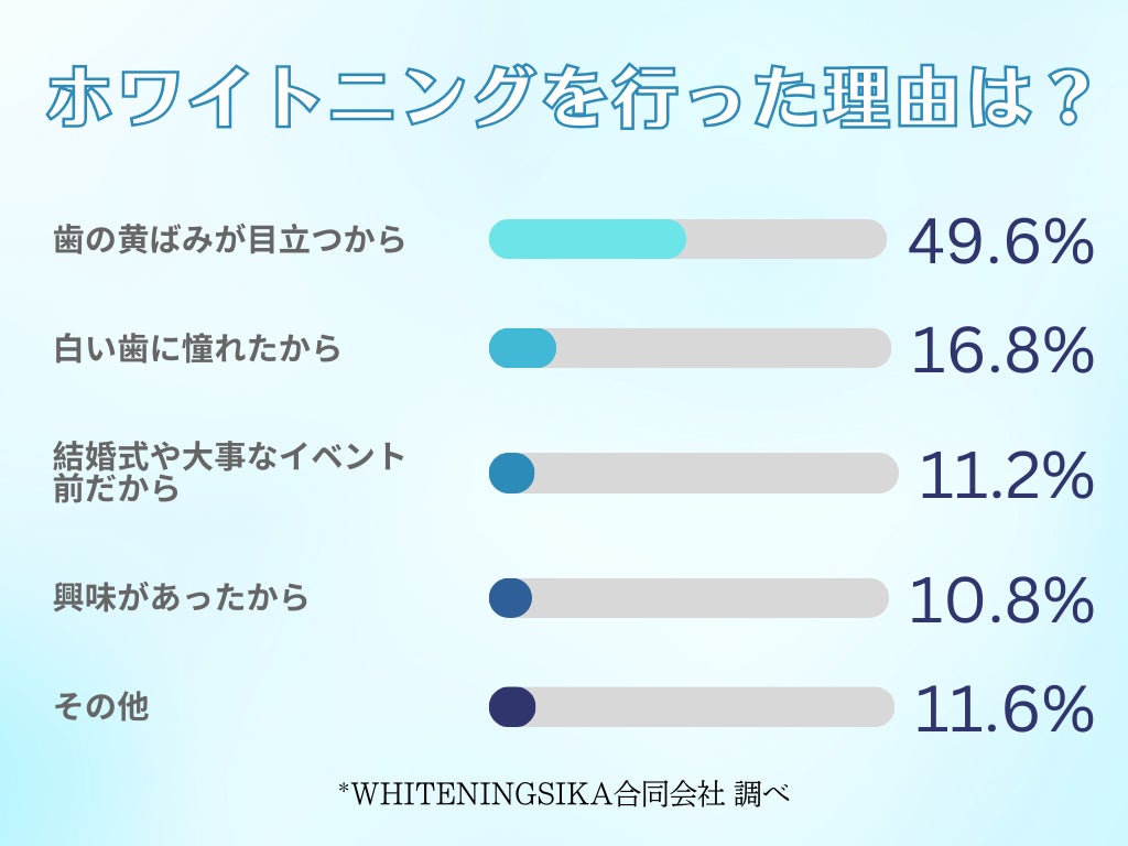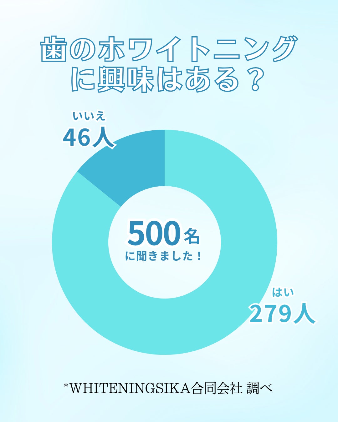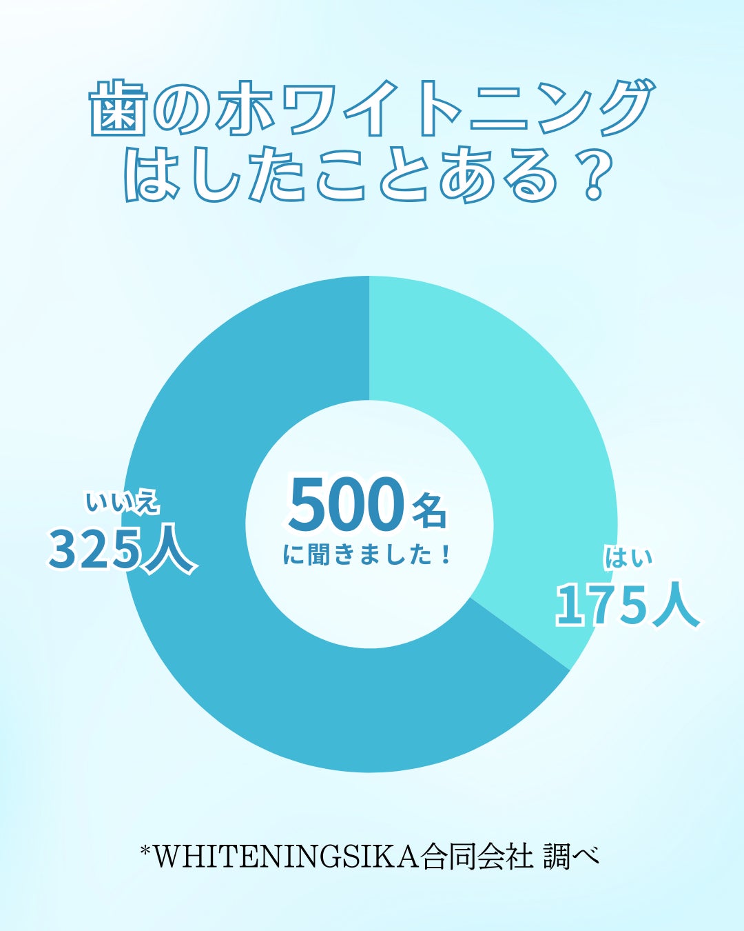 WHITENINGSIKA合同会社は、全国500名を対象に「歯のホワイトニングに関するアンケート」を実施。WHITENINGSIKA合同会社(本社:渋谷区 / 代表:白坂隼一)が運営するメディア「ホワイトニング歯科(https://whiteningsika.co.jp/)」は、全国500名を対象に「歯のホワイトニングに関するアンケート」を実施いたしました。歯のホワイトニングをしたことがある人には『ホワイトニングをおこなった年齢は?』・『やってみた感想は?』歯のホワイトニングをしたことがない人には『興味はありますか?』このような質問を計8問、アンケートで集計しました。*弊社サイトからも見れます。⇨ https://whiteningsika.co.jp/image-survey-3/