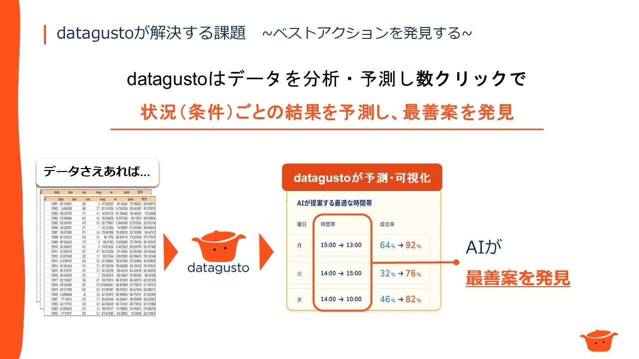 『datagusto』は、これらの高度な専門知識や工数が要求される処理を自動化しています。専門知識を持たないユーザでも『datagusto』を利用することで、「14時」に架電すれば「担当者に繋がる確率が最大化できる」など、どのような条件のときにベストな結果が出るのかを知り、「次の一手」を決定出来るようになります。AIでしばしば課題として挙げられる「予測に対する説明可能性」も提供してくれます。
