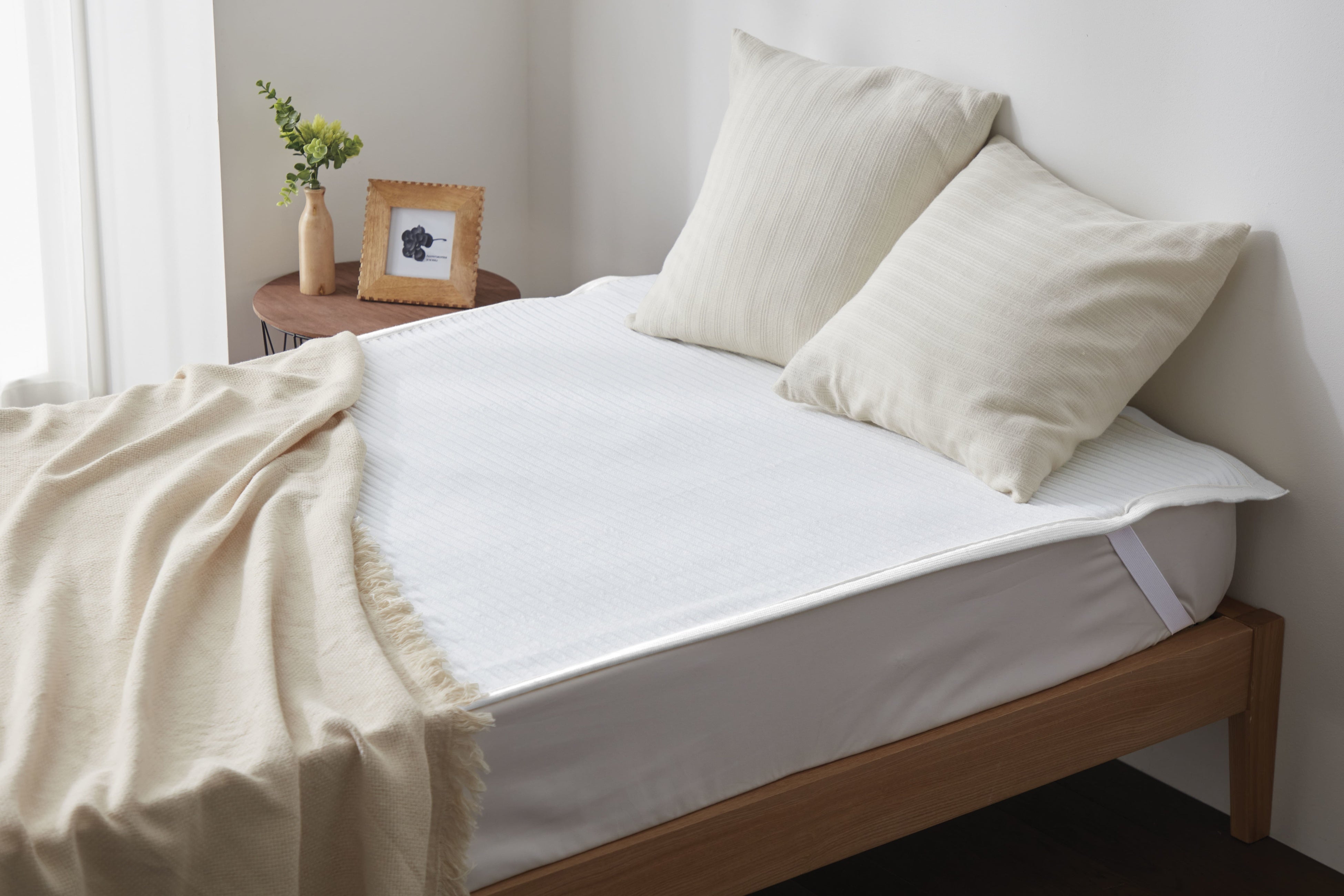 第一弾の敷きパッドと比べ、ゴムの位置を内側に改良したことで、約5cm厚いマットレスにも装着ができるようになりました。