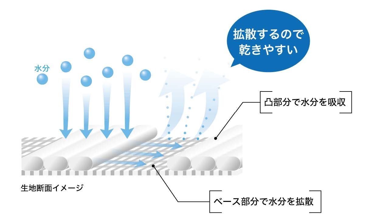 肌に触れる凸部分には、吸水性・吸湿性に優れたコットンを使用し、特別な加工を施し油分を除去することで、ドライな質感に仕上げました。