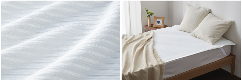 昨年5月に販売した第一弾の敷きパッドの編み地を改良し、吸水性・吸湿性の高いコットンと独自開発したオリジナル糸を組み合わせることでさらに通気性を高め、じっとり感を軽減させた、サラリとした寝心地の敷きパッドが完成しました。