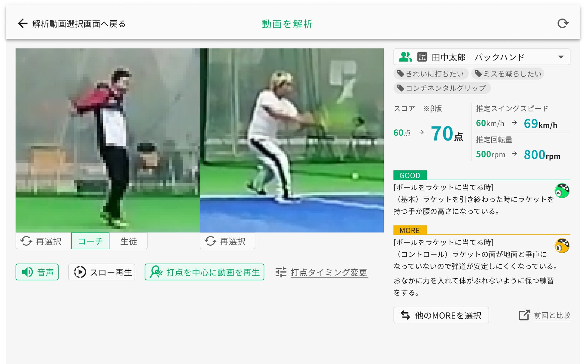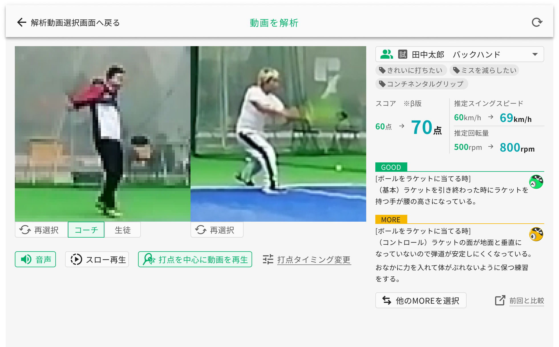 前回の実証実験を通じて、コート上でのコーチは非常に多忙であることが確認されました。またお客様からは「AIとコーチにいつも言われていることが同じ」や、「プレイを見ながら確認できるので修正しやすい」などのお言葉をいただきました。そのため、本格導入TennisLaboの開発では、コーチの負担を最小限に抑えつつ、最大の効果を発揮できるよう、アプリのユーザーインターフェース(UI)の簡素化が重要なポイントとなりました。このアプローチにより、コーチは生徒により集中して指導する時間を確保でき、指導の質の向上に繋がります。