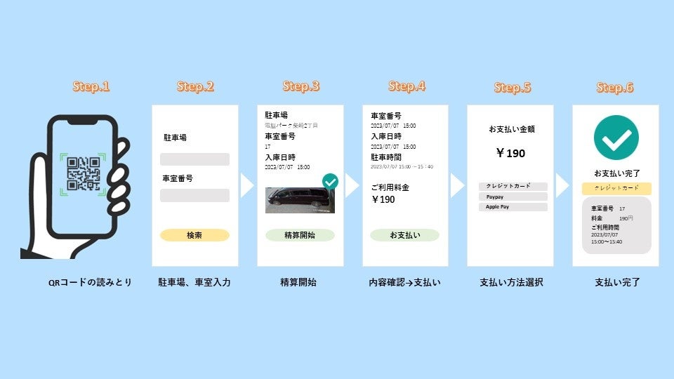 独自開発のAI技術を活用した新しいコインパーキングシステムです。AIカメラとクラウドサーバーが駐車中の車を認識し、入出庫時間、利用料金等を管理します。従来パーキング運営に必要であったフラップ板、ループコイルセンサー、ゲート、発券機、精算機などの多くの機材を必要とせず、AIカメラのみで運営します。クレジットカードやPayPayなどを利用し、スマートフォンからキャッシュレス決済で駐車料金を支払うことができます。