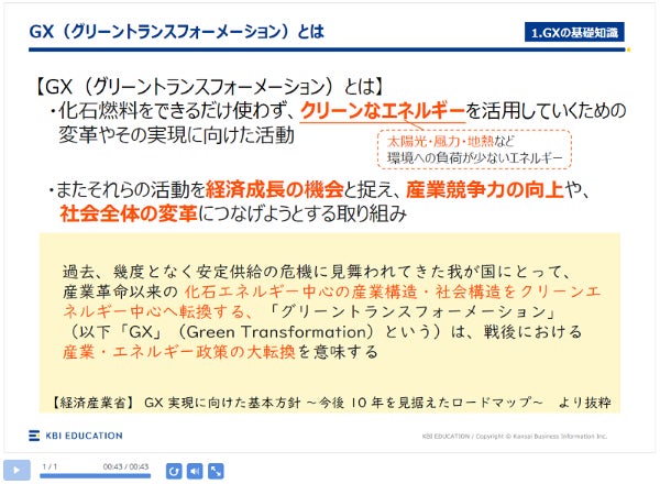 企業向けの教育・研修サービスを開発・提供している関西ビジネスインフォメーション株式会社(大阪府大阪市、代表取締役社長:武枝 和彦、以下「当社」)は、今後企業の取り組みとして求められるGX(グリーントランスフォーメーション)をテーマにしたeラーニングコースの提供を開始いたしました。GXを推進できる人材を育成するため、GXの基礎的な知識や企業が環境問題に取り組む意義について学べるカリキュラムです。