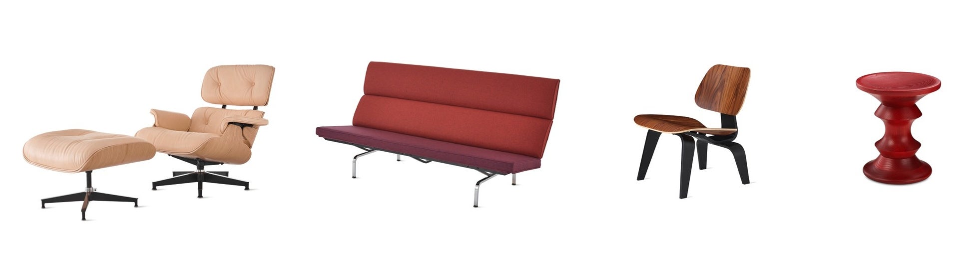 (写真左より)Eames Lounge & Ottoman Natural Leather、Eames Sofa Compact Duo-Tone、Eames LCW Duo-Tone、Eames Walnut Stool Special Edition