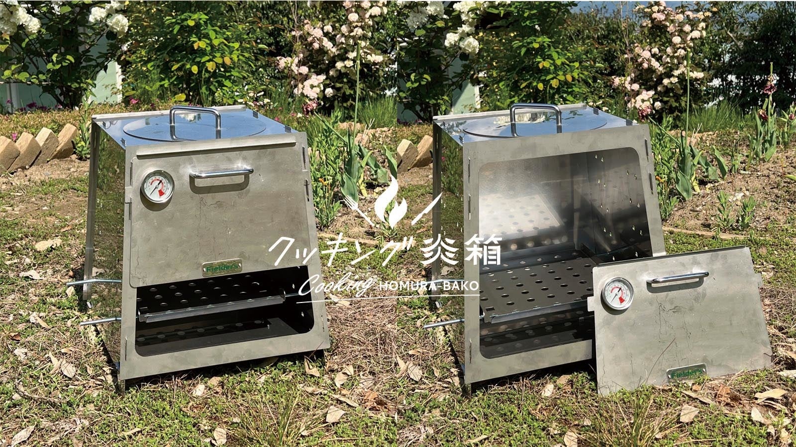「クッキング炎箱(ほむらばこ)」には温度計付きの前蓋が標準付属。簡単にオーブン空間が作り出せ、かつ温度管理ができるので、料理の幅が一層広がります。
