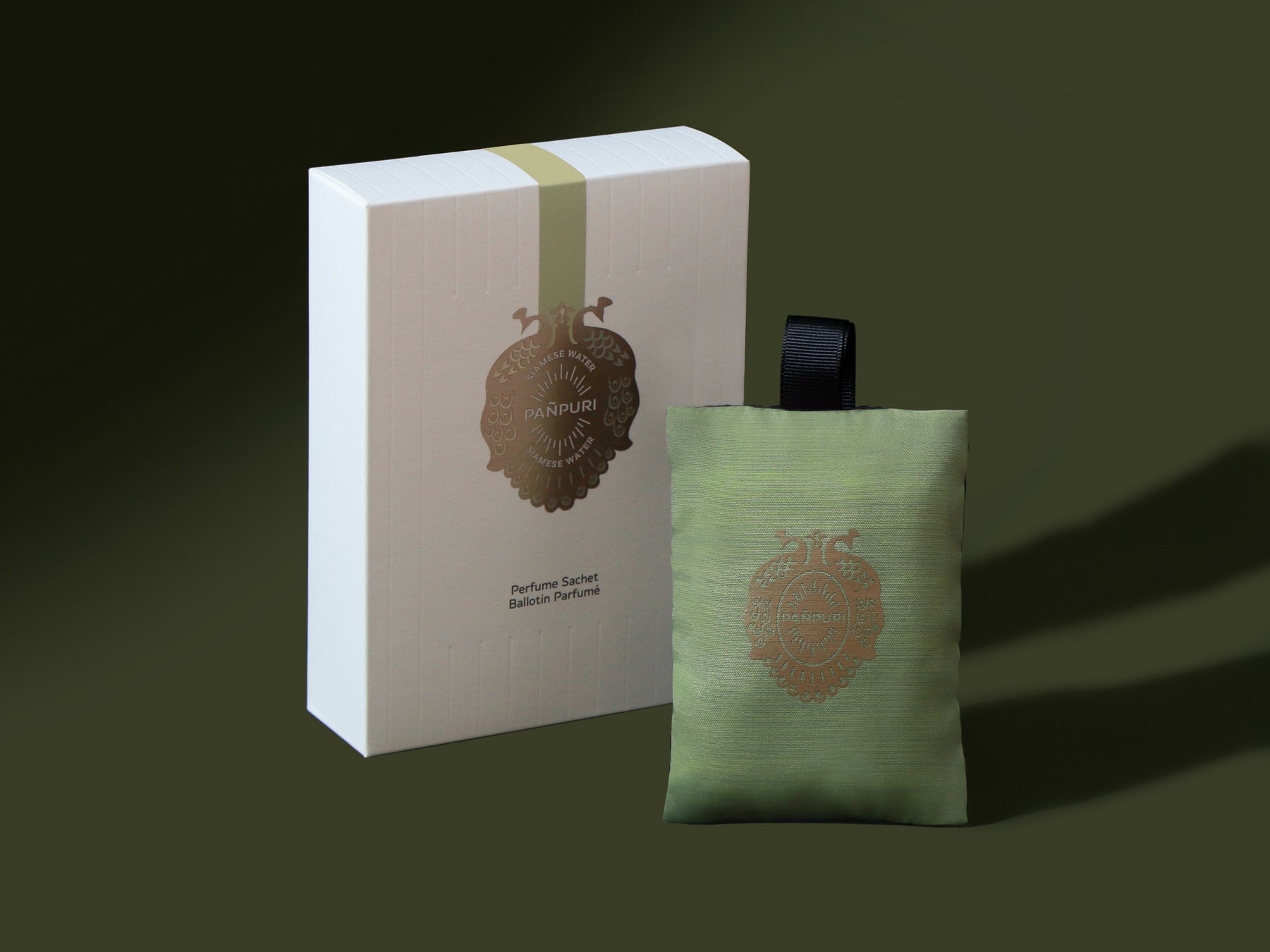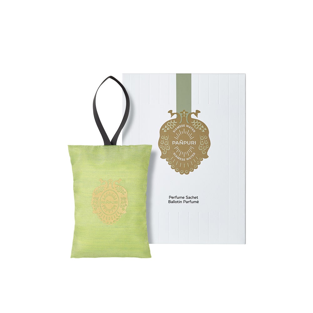 パンピューリのエンブレム〈孔雀〉が印象的な美しいサシェの中にはタイの伝統的な技法で作られた、ゆっくりと香りが広がる香りのビーズ。香りは、約3ヶ月間お楽しみいただけます。