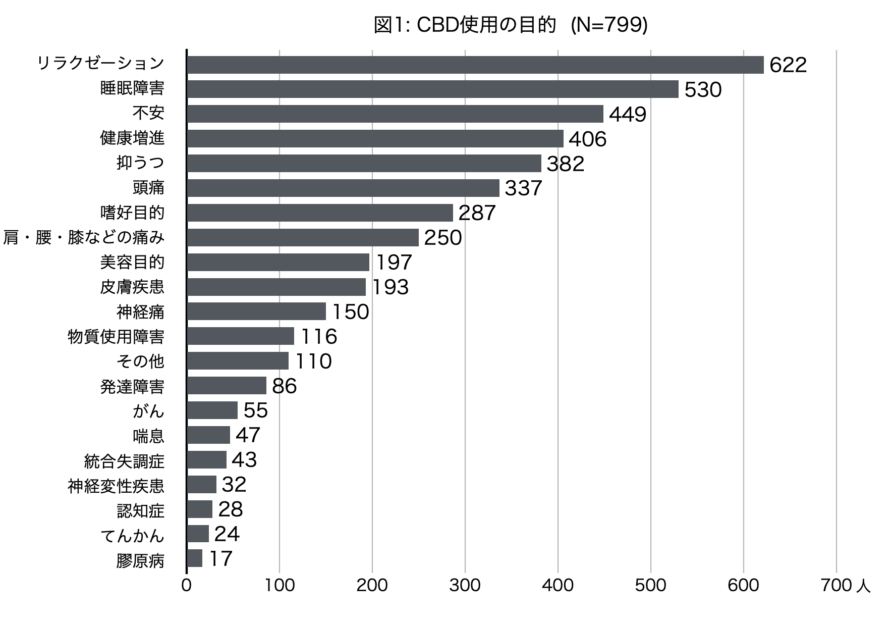 CBD使用経験者(過去1年以内にTHCを含む大麻使用者を除く)を対象としFacebook,、Twitter、YoutubeなどのSNSを用いて回答を依頼したところ、799件の有効回答が得られました。CBD製品の用途として多かったのはリラクゼーション(77.8%)、睡眠改善(66.3%)、不安(56.2%)、健康増進(50.8%)、抑うつ(47.8%)であり、使用者は平均して5.5の目的に対してCBDを使用していました。