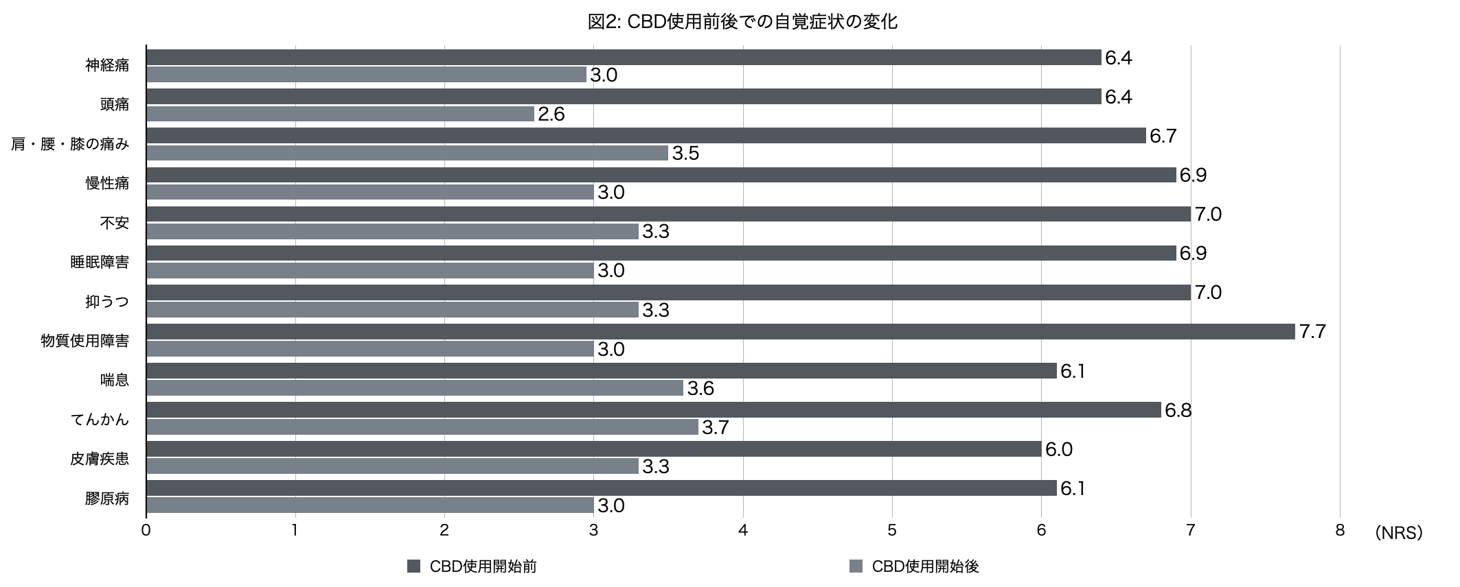 使用前後の各症状についての重症度自己評価で50%以上の改善を自覚していた割合は以下のとおりでした。(頭痛70.9%、慢性疼痛67.8%、睡眠障害67.4%、物質使用障害66.7%、神経痛65.5%、抑うつ62.4%、不安59.6%、関節痛54.5%、膠原病50.0%、皮膚疾患49.7%、てんかん42.1%、ぜんそく37.8%)
