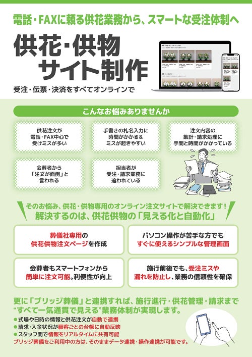 供花・供物をオンラインで簡単注文できるスマホ対応サイト。クレジット決済、注文管理画面、デザインカスタムなど幅広く対応します。