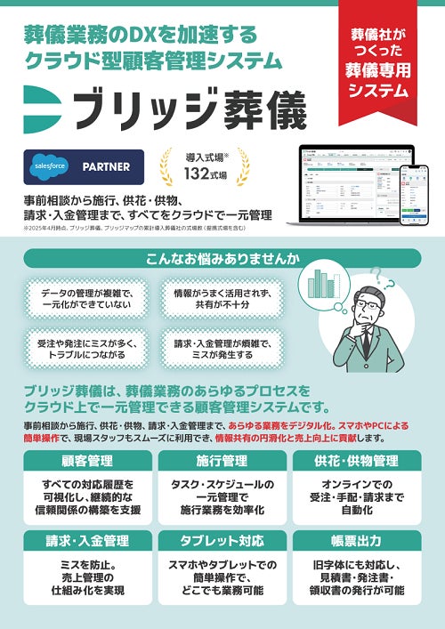 Salesforceを活用した葬儀社向けCRMプラットフォーム。事前相談~施行後フォローまで顧客対応履歴を一元管理し、営業・接客の属人化を防止。チーム全体での情報共有が可能です。