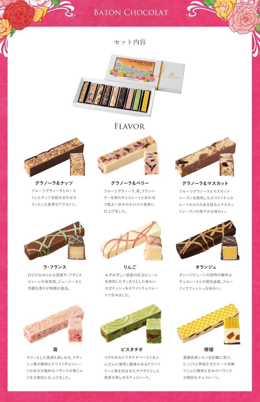 ・バトンショコラ 9本入(グラノーラ&ナッツ、グラノーラ&ベリー、グラノーラ&マスカット、ラ・フランス、りんご、オランジュ、苺、ピスタチオ、檸檬 各1本) 1個