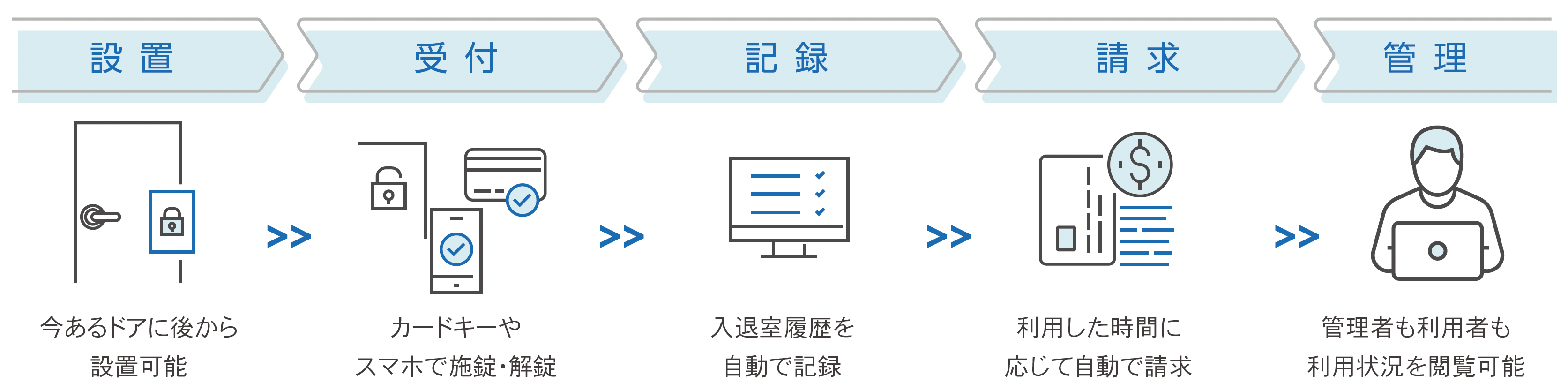 コワーキングスペース・シェアオフィス・貸会議室・フィットネスクラブ・レンタル教室など、従来は、受付業務や請求・消込業務が必要だった施設運営の自動化・無人化・省人化を実現するツールとしてご活用いただくことで、これからも現場のDX推進に貢献いたします。