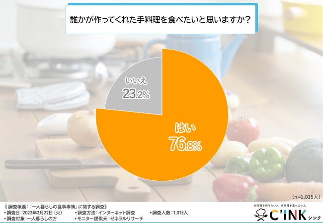そこで、「誰かが作ってくれた手料理が食べたいと思いますか?」と質問したところ、『はい(76.8%)』『いいえ(23.2%)』という結果になりました。