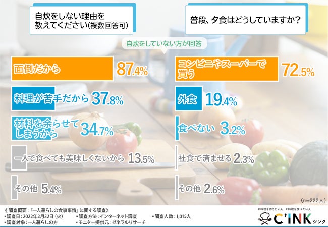 「自炊をしない理由を教えてください(複数回答可)」と質問したところ、『面倒だから(87.4%)』と回答した方が最も多く、次いで『料理が苦手だから(37.8%)』『材料を余らせてしまうから(34.7%)』と続きました。