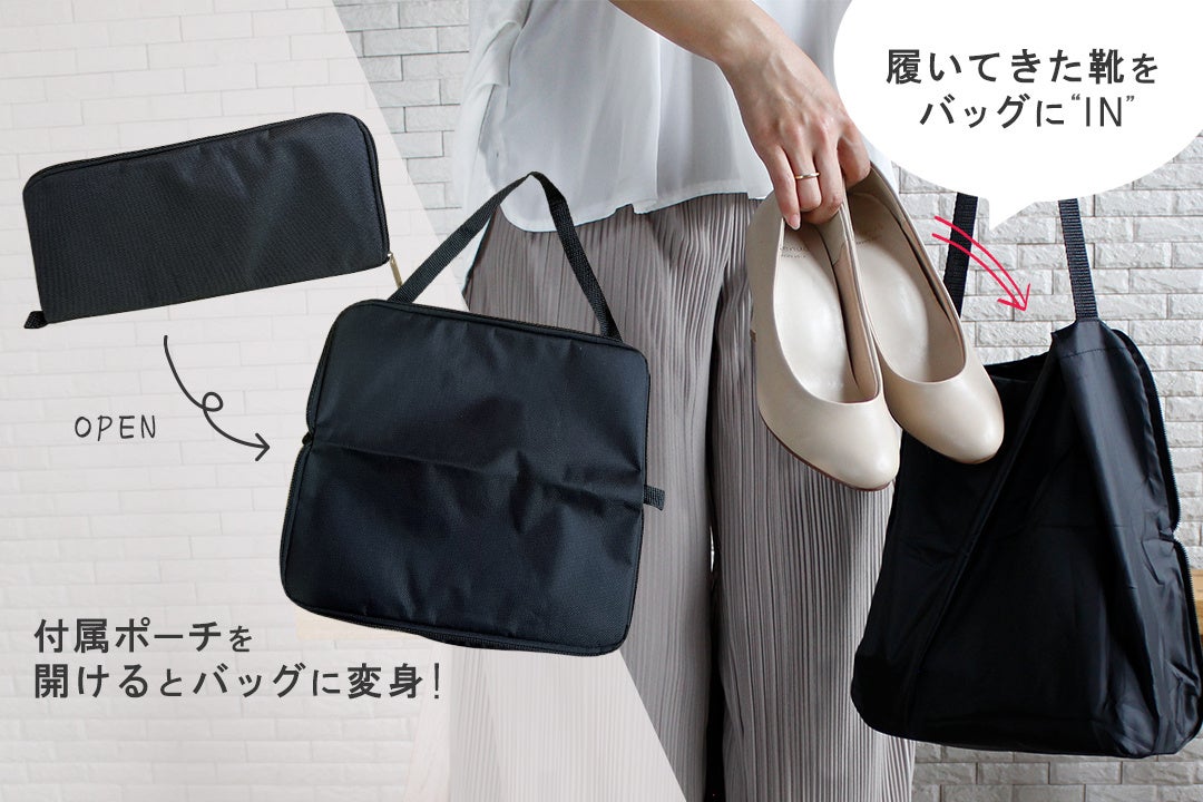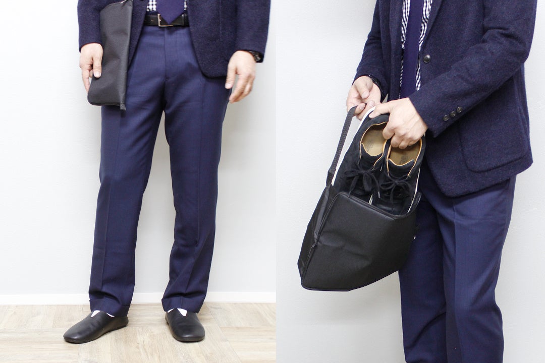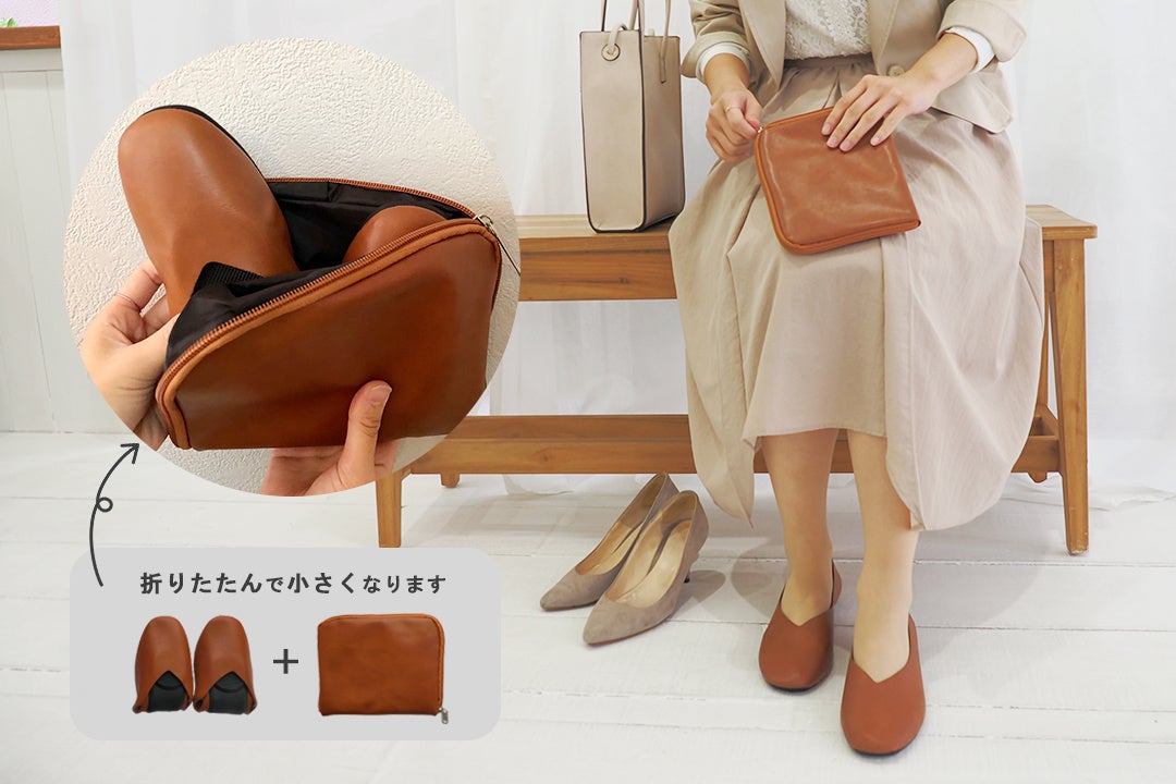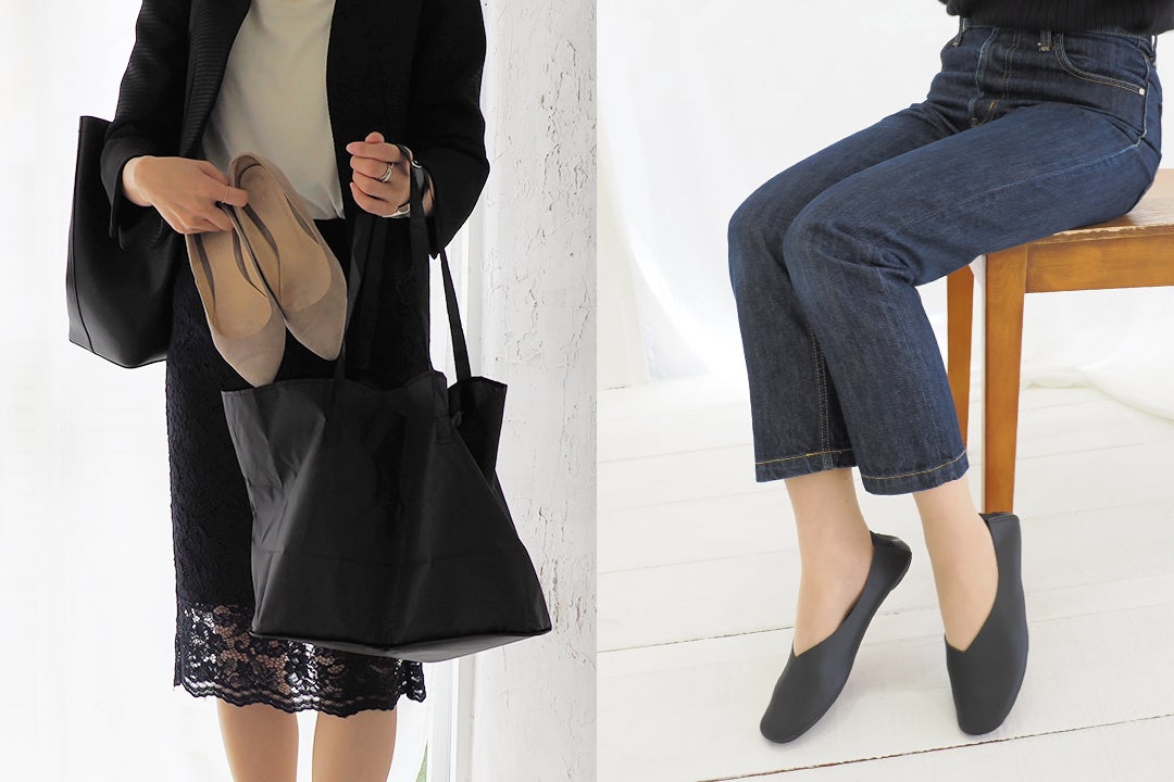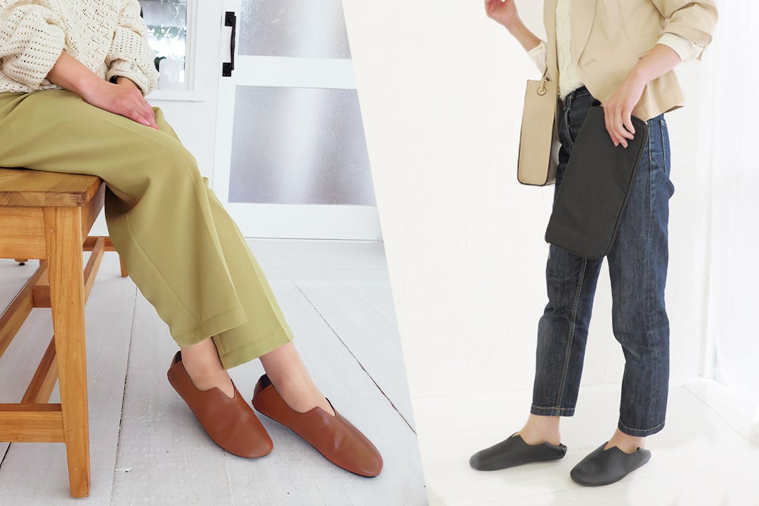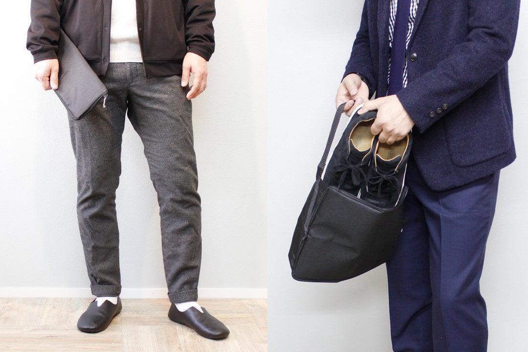 「レ プリエ ノイエ ルッツ」との機能面での大きな違いは、靴を折り畳んで収納し、よりコンパクトに持ち運べるところです。ポーチがトートバックになり、履いてきた靴を収納できる仕様や、バブーシュとしても使用可能というポイントは同様です。