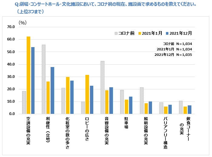 一方で、「ロビーの広さ」は第2位→第4位へランクダウンし、代わりに「利便性(立地)」が第4位→第2位にランクアップしました。「利便性(立地)」が、コロナ前の時点で第1位(55.7%)だったことと合わせて考えると、コロナ前と同様に、「施設へ足を運び、リアルで鑑賞を楽しみたい」というニーズが高まっているとも捉えられます。