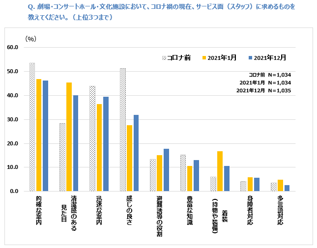 尚、コロナ前に求められたものと比べてみると、コロナ前、第2位だった「感じの良さ」は第4位にランクダウン。代わりに第2位にランクアップしたのは「清潔感のある見た目」でした。今回の結果と合わせて考えると、鑑賞者は引き続き、「おもてなし」よりも「感染症対策」を指示していると言えます。