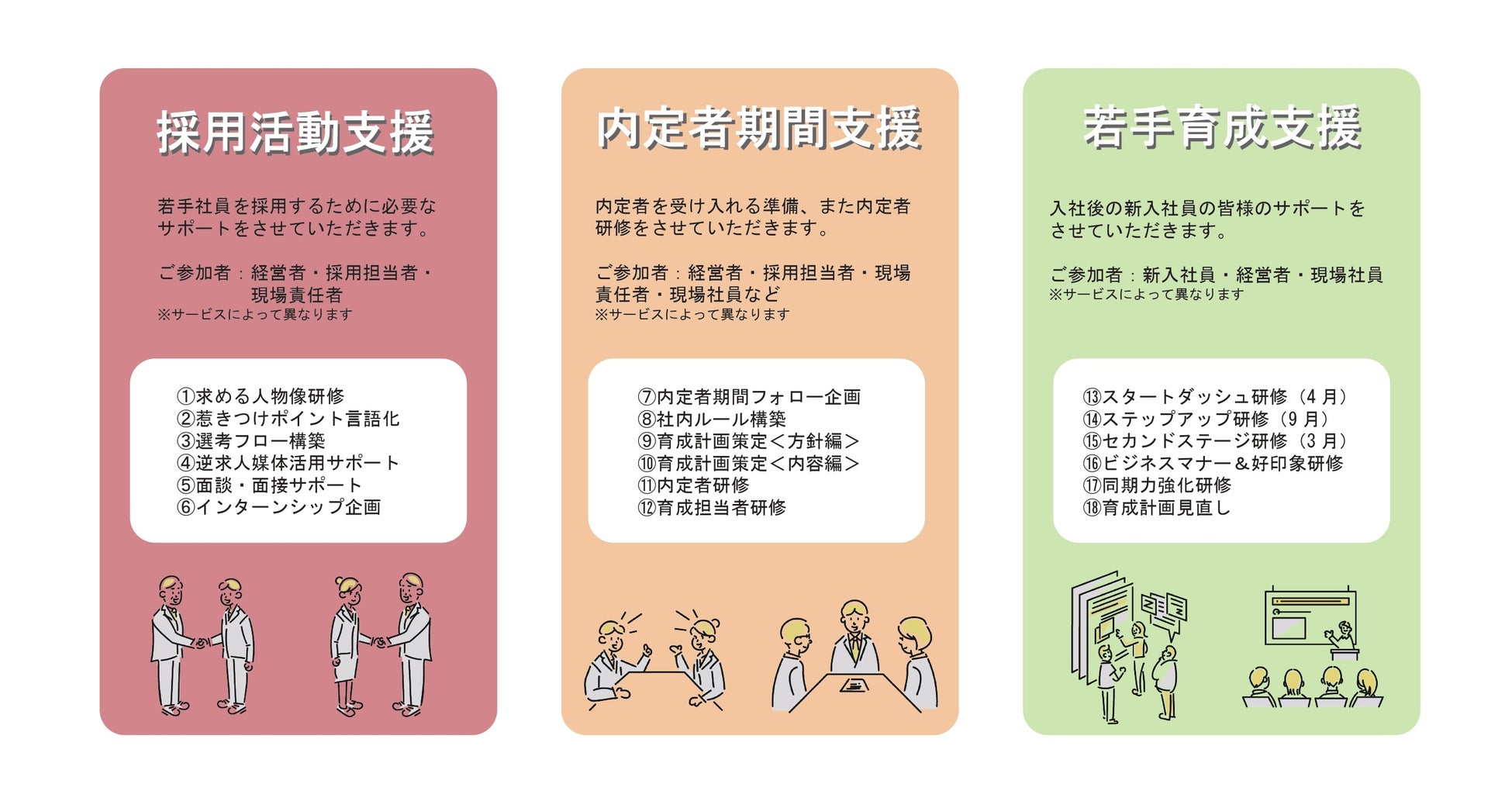 採用人数10名以下の中小企業様に向け、全社員で行う、新卒採用・育成サポートを行います。各会社のお悩みごとに1つからカスタマイズ可能です。