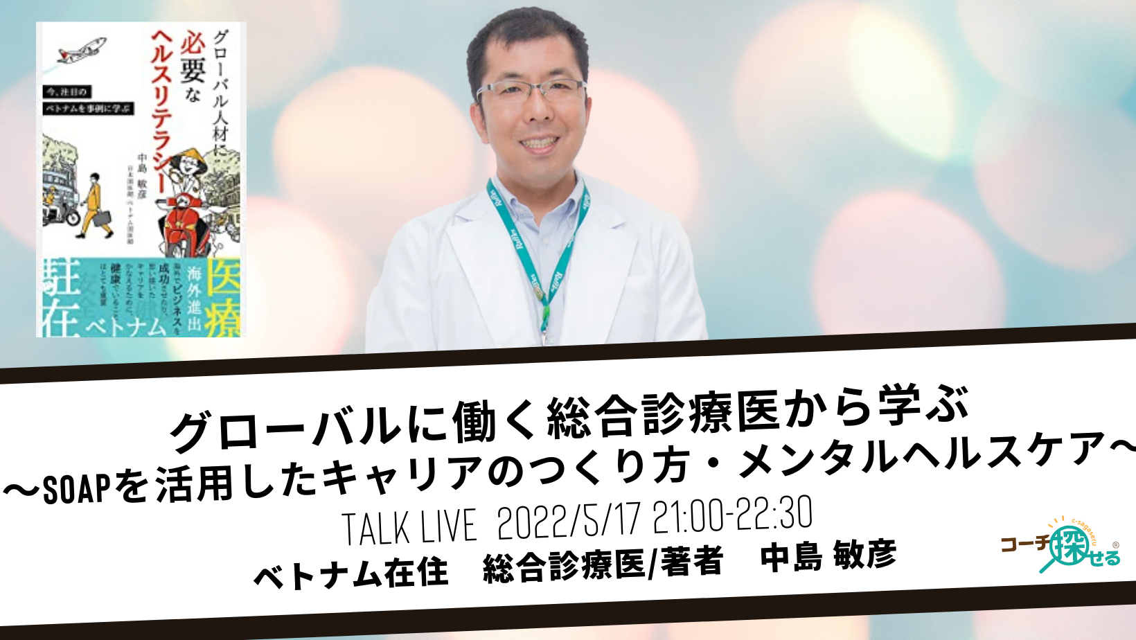 株式会社シェヘラザード(住所:東京都中央区 代表:坂本祐央子)は、コーチを無料で探して連絡できるプラットフォーム「コーチ探せる」主催5月オンラインセミナー「グローバルに働く総合診療医から学ぶ〜SOAPを活用したキャリアのつくり方・メンタルヘルスケア」を2022年5月17日(火)21時より開催致します。【URL】https://www.c-sagaseru.com/events/view/6