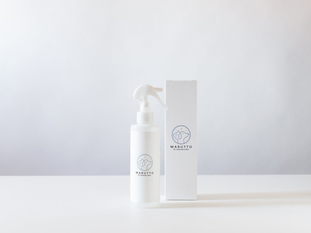 洗った後の乾燥を抑えるために「マルットペットスキンケアスプレー」を提供しています。こちらもシャンプーと同じく天然・植物成分100%。人の美容液にも使用される低分子のヒアルロン酸を配合することで高保湿を実現しています。