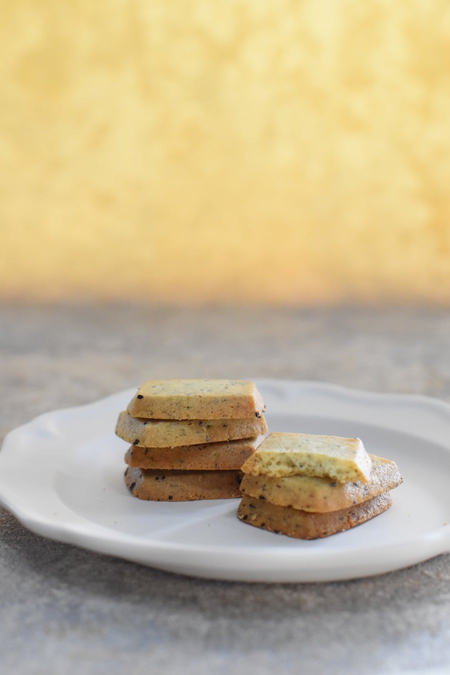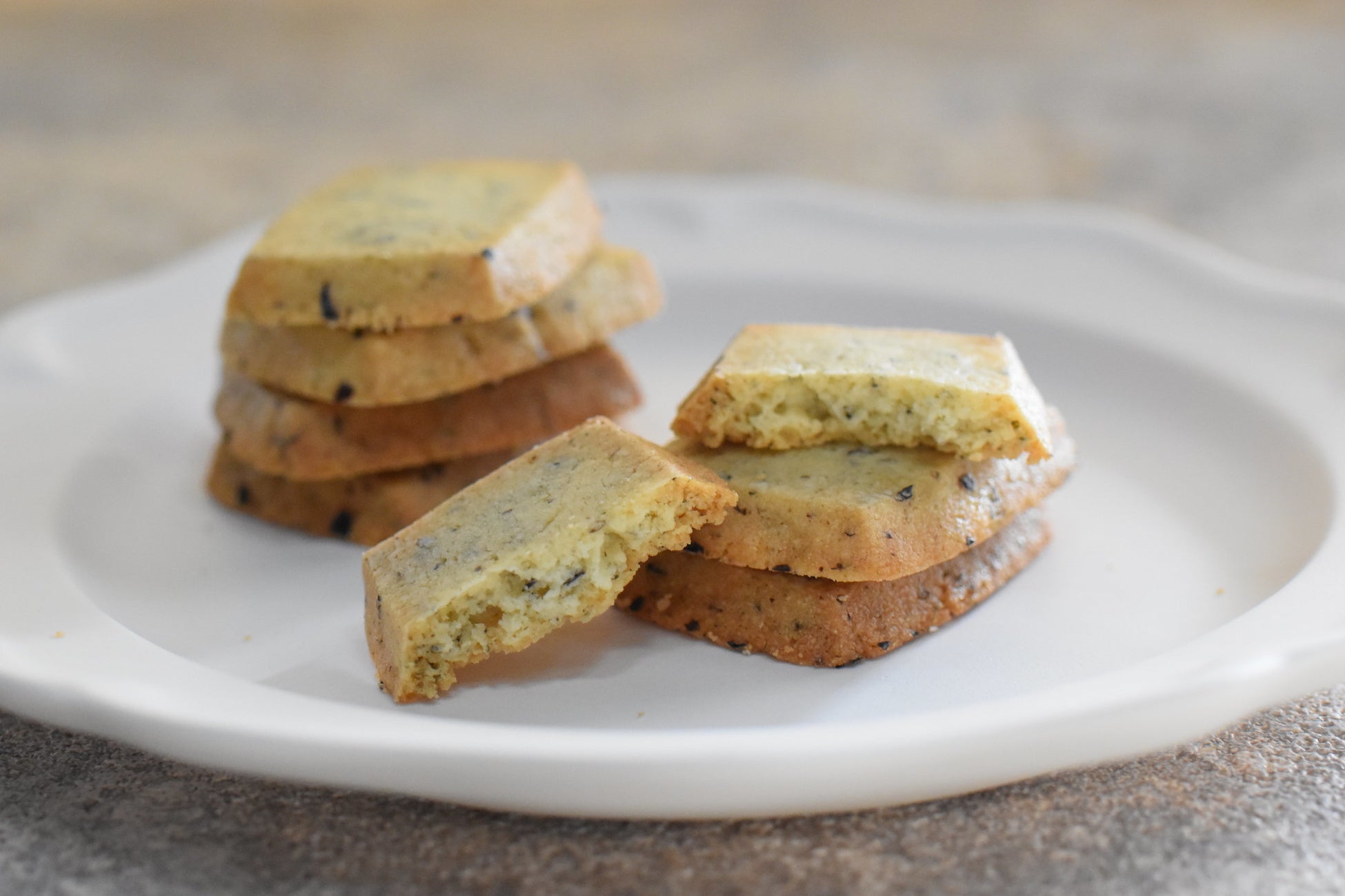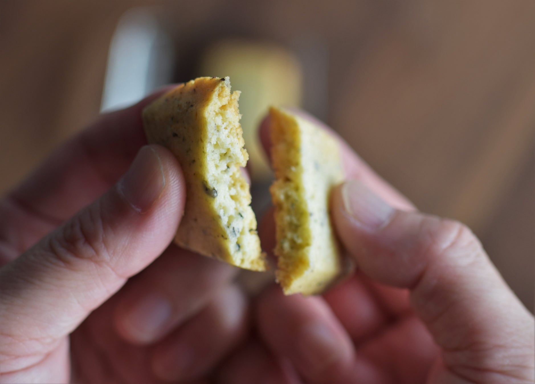 サブレ生地は、リッチな香りを楽しめるように国産発酵バターを使用し、表面はサクッと、中はホロッとした食感に作り込みました。使用する海藻を独自にブレンドし直し、海藻フレークの粒度やロースト時間、温度を細かく調整して、焼菓子と調和させた優しい海の香りをサブレで表現しました。さらに粒度の細かな塩竈(しおがま)の藻塩を加えることで、芳醇なバターの味わいと甘さがありながらも塩味のキレを出すことで、最後まで美味しさを感じてもらえる一枚に仕上げています。