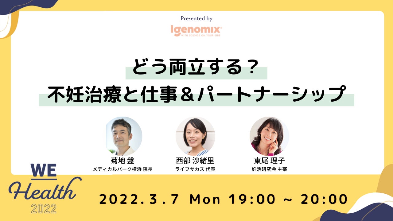 国際女性デーオンライントークイベント「アイジェノミクスプレゼンツ どう両立する?不妊治療と仕事&パートナーシップ」が、女性をエンパワーメントするヘルスケアイベント「WEHealth2022」にて開催されます。