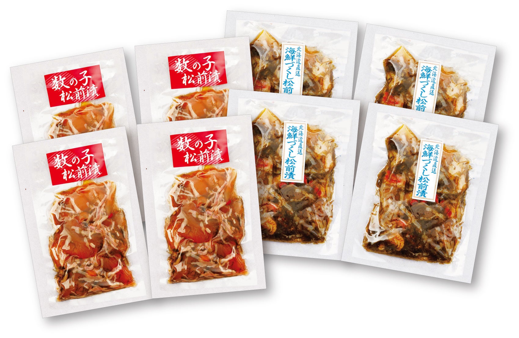 (「数の子70%入り松前漬」180g×4、海鮮づくし松前漬」180g×4)