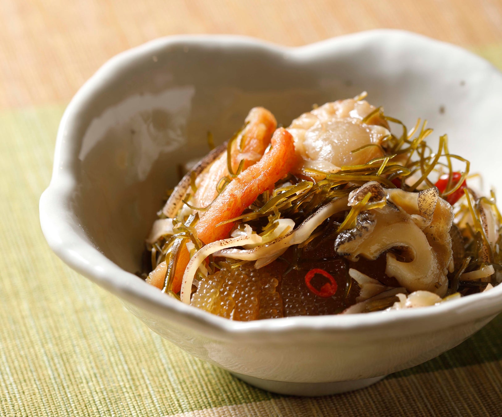数の子・するめいか・昆布を醤油ベースのタレに漬け込んだ、江戸時代からの歴史を持つ北海道の郷土料理「松前漬」。