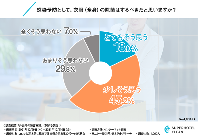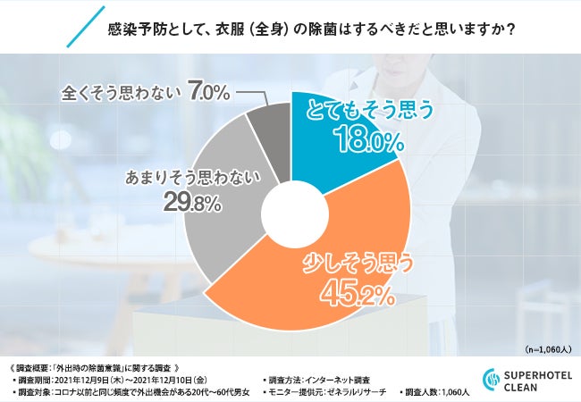 「感染予防として、衣服(全身)の除菌はするべきだと思いますか?」と質問したところ、『少しそう思う(45.2%)』と回答した方が最も多く、次いで『あまりそう思わない(29.8%)』『とてもそう思う(18.0%)』と続きました。