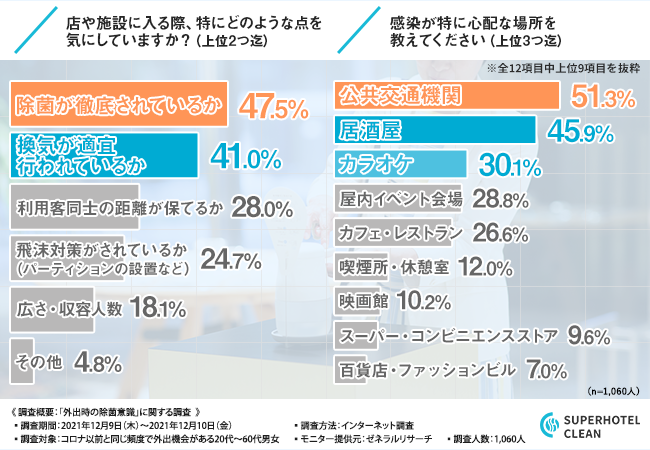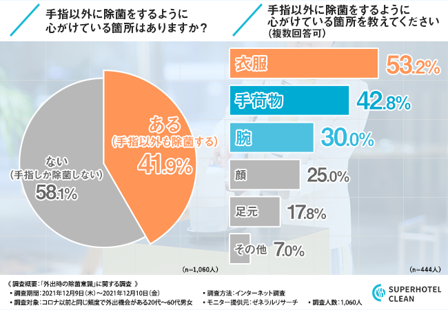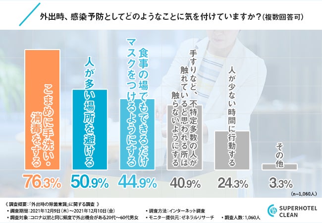 株式会社スーパーホテルクリーン(本社所在地:東京都中央区、代表:安藤 周二)は、コロナ以前と同じ頻度で外出機会がある20代~60代男女を対象に、「外出時の除菌意識」に関する調査を実施しました。