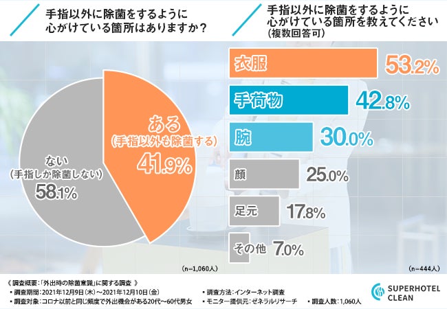 そこで、「手指以外に除菌をするように心がけている箇所はありますか?」と質問したところ、4割以上の方が『ある(手指以外も除菌する)(41.9%)』と回答しました。