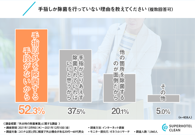 衣服や手荷物を除菌する方法がなかったり、面倒くさかったりとの回答が、合わせて7割以上を占める結果となりました。