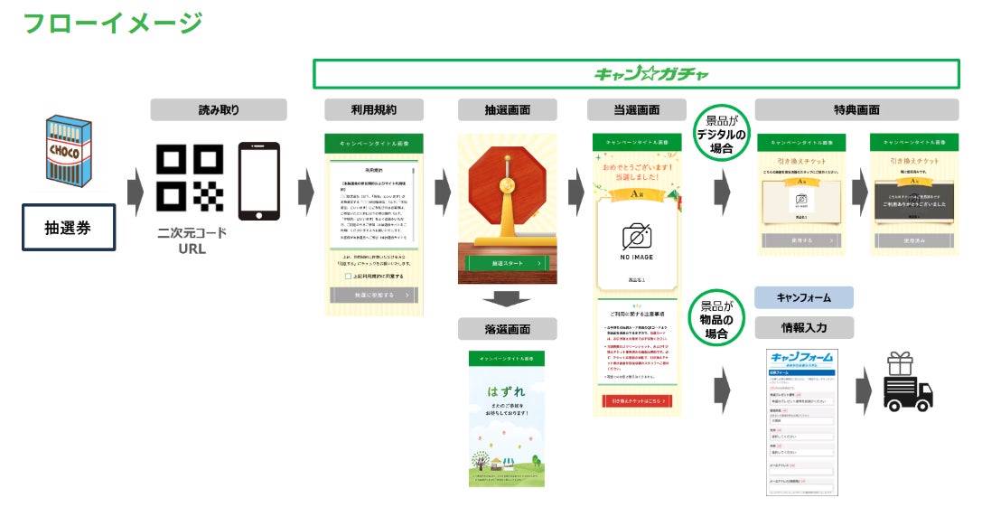 認知拡大、購買・来店促進など、さまざまなキャンペーンで活用できるインスタントウィン機能をサービス提供し、初期設定から実施中の運用までをご支援します。二次元コード、シリアルコード等を入口にスマートフォンでどこでも参加できて、即時当落が分かるインスタントウィンシステム「キャン☆ガチャ」は、企画ごとに景品や抽選画面のカスタマイズができます。賞品を後日発送する場合には個人情報を取得するWebフォームとの組み合わせも可能です。多様なキャンペーンに対応し、すぐに取り入れられるインスタントウィン機能をご提供します。
