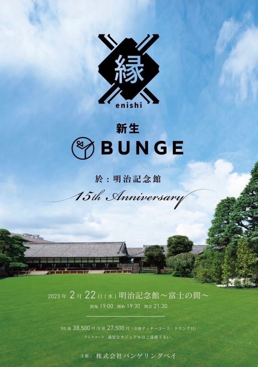 なお、2008年のオープンから15周年を迎えた今年は、日頃からお世話になっている会員様をはじめ、多くの方々に新生『BUNGE』の魅力をお披露目するべく、特別イベント「BUNGE 縁 -enishi-」を東京・明治記念館にて開催するこが決定いたしました。