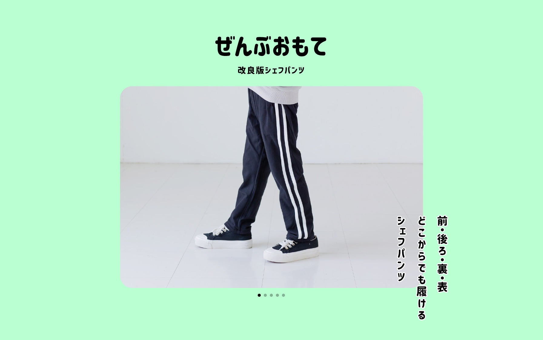 第16回キッズデザイン賞を受賞した、前後裏表どこからでも着られる「ぜんぶおもて」の改良版シェフパンツも販売開始