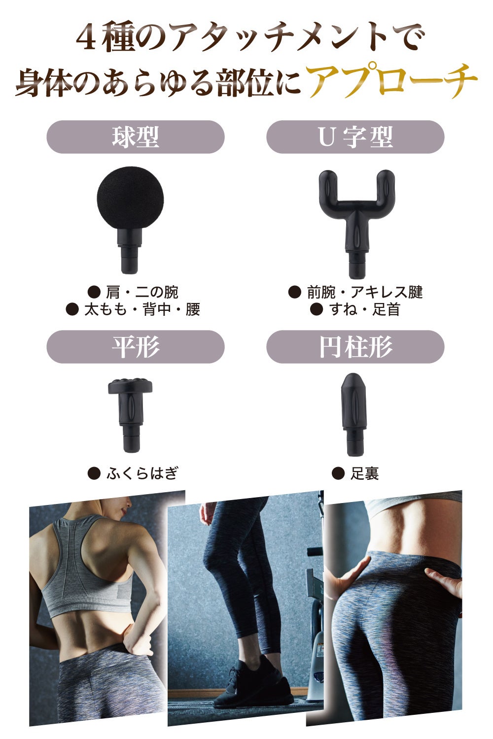 また先端のアタッチメントが4種類付属されており、肩・二の腕はもちろんのこと、腰・太ももから足裏まで、身体のあらゆる部分を刺激することができます。