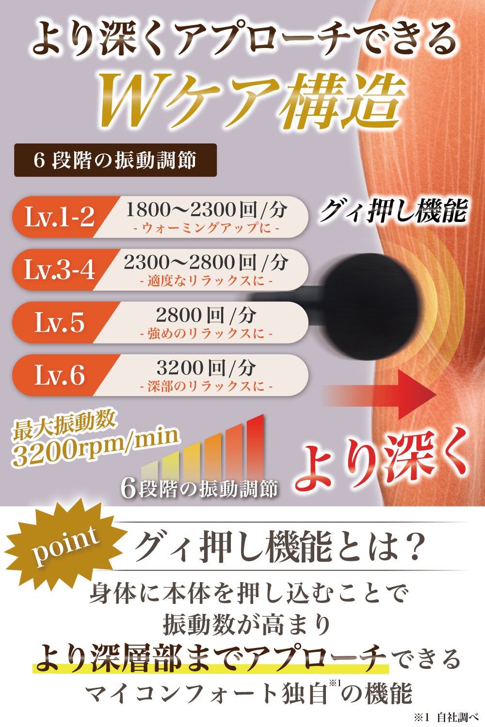 振動数は1800回/分〜3200回/分と幅広く、老若男女問わずリラックスできるよう設計されております。