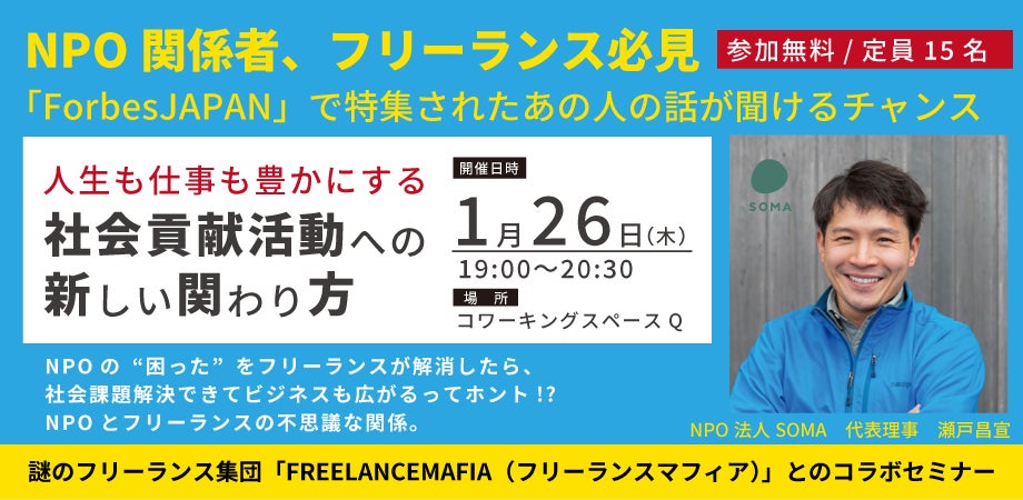 ビジネス誌ForbesJAPANでも特集されたNPO法人SOMA(福岡県福津市 代表理事:瀬戸昌宣)と福岡を拠点に活動する謎のフリーランス集団FREELANCEMAFIA(フリーランスマフィア)は、NPOとフリーランスが協業することで社会課題解決をスムーズにし、人生も仕事も豊かにできる「社会貢献活動への新しい関わり方」のセミナーを2023年1月26日(木)19:00〜20:30、コワーキングスペースQ(JR博多駅地下1F)にて開催いたします。