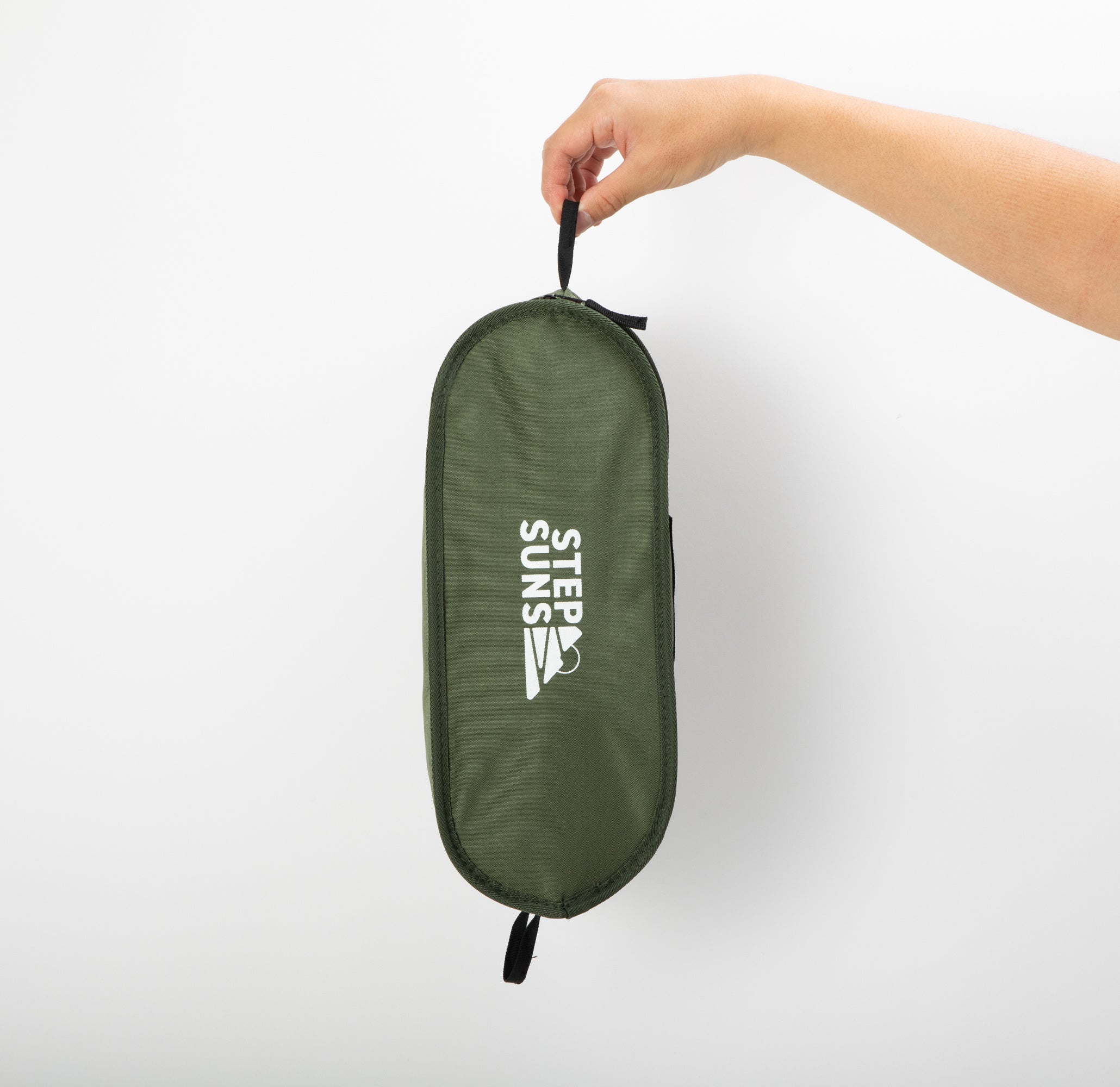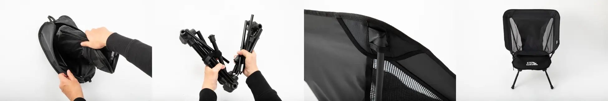 チェアの収納ケースは、チェアのフレームに取り付けて小物入れとしても使用可能。従来品ではファスナー面を上にするとブランドロゴが逆さま状態でした。改良品では印刷向きを変更し、ロゴが上を向くように!