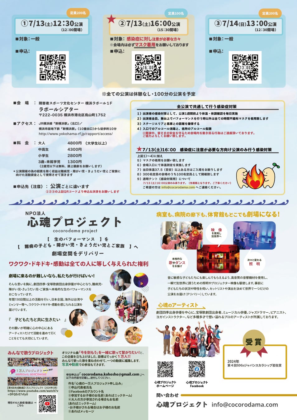 劇団四季や宝塚歌劇団出身俳優が中心となり「難病児・障がい児・きょうだい児・ご家族へ」オリジナルミュージカルや歌・踊りを楽しめる「劇場空間」をお届けする心魂プロジェクト。設立当初はプロパフォーマーのみで構成されていましたが、創立10周年を向けた今では、「私も舞台に立ちたい!」と手を挙げた難病や障がいのある子ども達が多くの方々に勇気や感動を与える立派なパフォーマーとして成長しました。そんな彼ら彼女らもサマーフェスティバル2024に出演します。