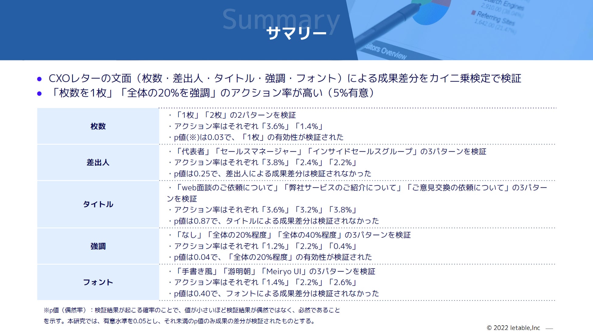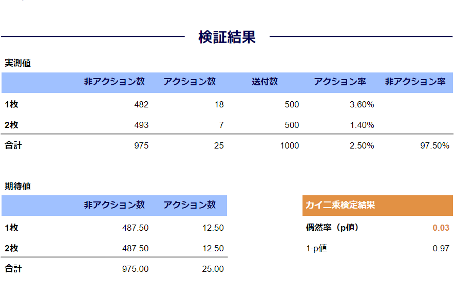 - p値は0.03であり、5%有意水準において枚数1枚のCXOレターの有効性が検証された