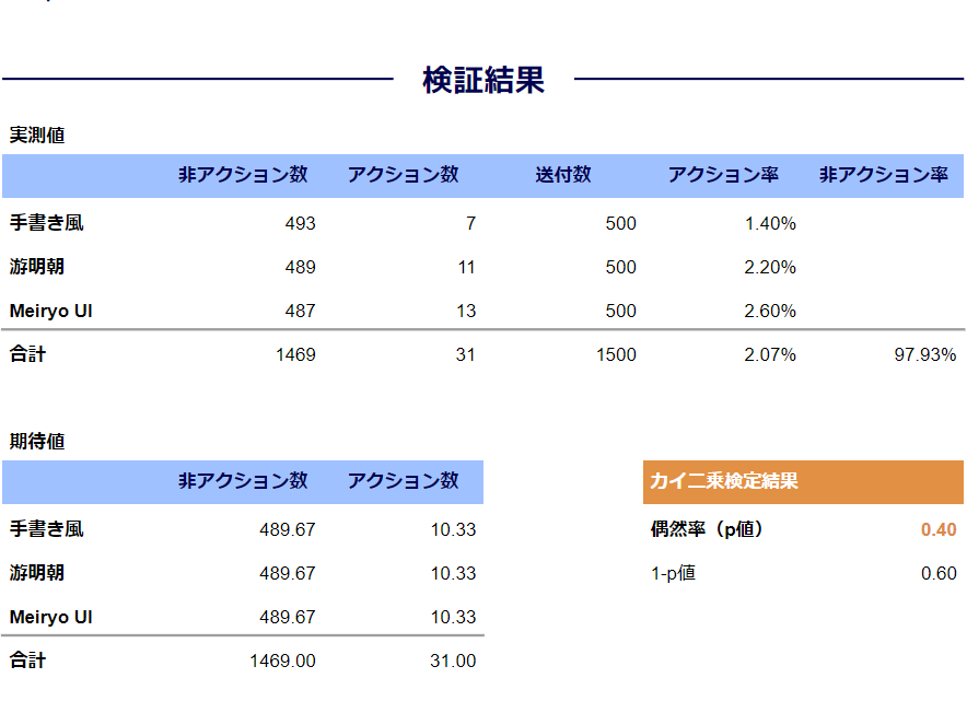 - 実測値として、Meiryo UIを使用した文面がアクション率2.6%と最も高い