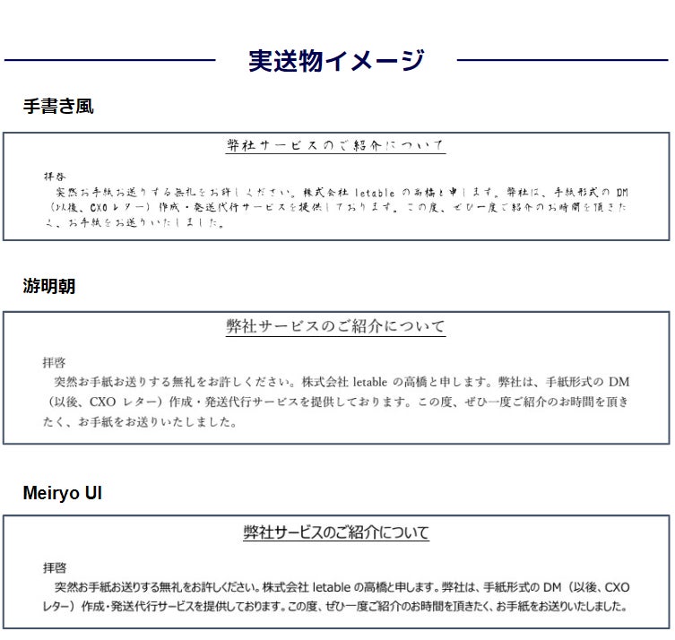 株式会社letable(本社:東京都渋谷区、代表取締役:高橋直也)が運営するCXOレターの作成/発送代行サービス「letable(https://letable.jp/)」は、CXOレターの有効な文面(同封する便箋の枚数やタイトル、使用するフォント)に関する調査を実施いたしましたので、お知らせいたします。