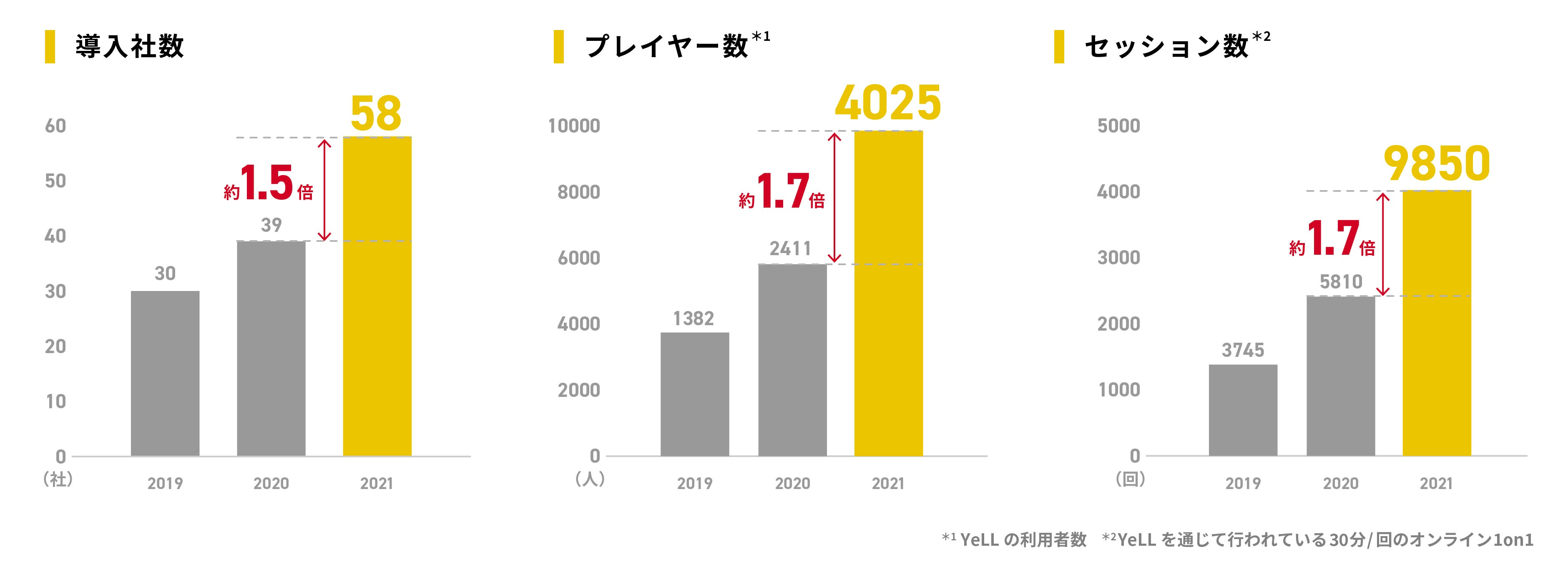 サポーターの増加とともに、導入する企業や利用者(プレイヤー)数、YeLLを通して行われるセッション数も増加し、導入企業は法律事務所からベンチャー企業、大手商社やメーカーまで大きく幅が広がっています。