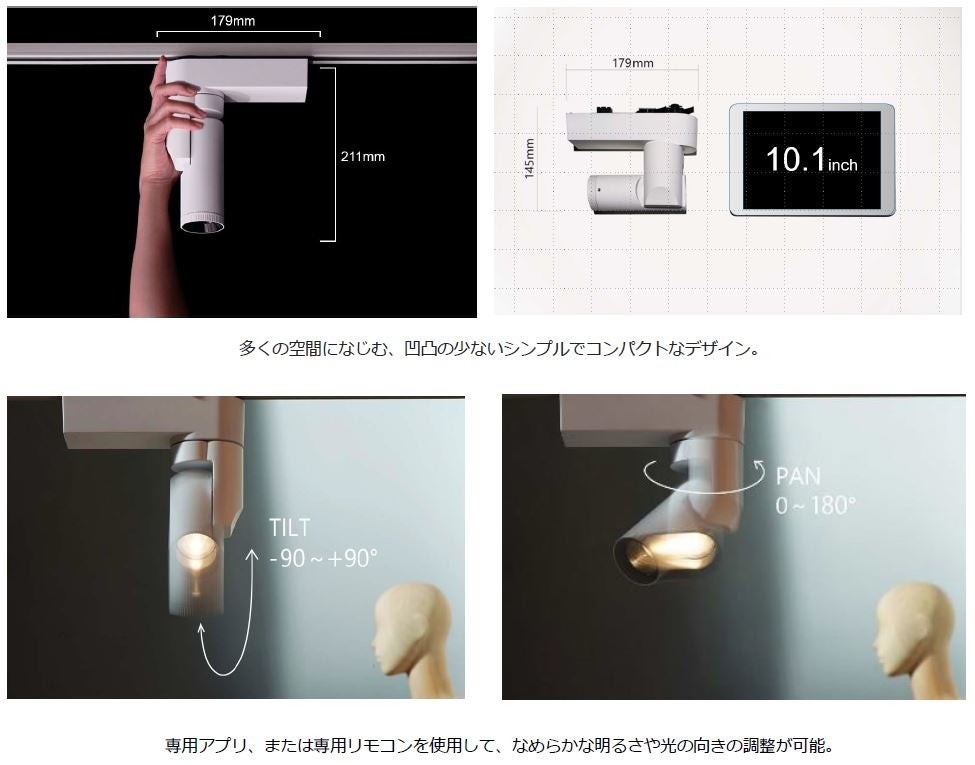 従来の無線可動タイプのスポットライトから、大幅なダウンサイジングを実現。一般のスポットライトと遜色ないサイズを実現。多くの空間になじむ、凹凸の少ないシンプルでコンパクトなデザイン。